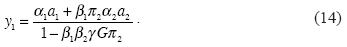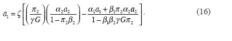 Es fácil ver que las ecuaciones (11) y (12) forman un sistema de ecuaciones diferenciales en que el valor de la brecha y la tasa de crecimiento del gasto autónomo son las variables de estado. Para solucionar el sistema es necesario escribir la ecuación (11) como una función de G y de α1. Usando (6) en (5):