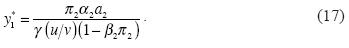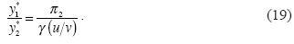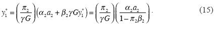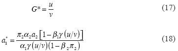 Con los valores de equilibrio de la brecha y el crecimiento del gasto autónomo, es posible encontrar las tasas de crecimiento de equilibrio del centro y la periferia. Primero usamos G* = (u/v) en la ecuación (15) para obtener la tasa de crecimiento de equilibrio en la periferia (y1*):