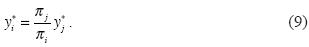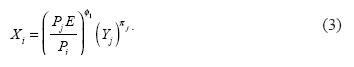 La ecuación (3) es una ecuación de demanda de exportaciones, en la que 0 es la elasticidad precio de la demanda (negativa) y π es la elasticidad ingreso de la demanda (positiva). Obsérvese que en un modelo de sólo dos países será cierto que Xj = Mj, y la elasticidad ingreso de las exportaciones de i corresponde a la elasticidad ingreso de las importaciones de j (πj).