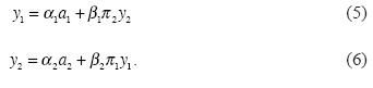 Las letras minúsculas representan tasas proporcionales de crecimiento (por ejemplo, p = (dP/dt) (1 / P) es la inflación interna). En las ecuaciones (5) y (6) y1 es la tasa de crecimiento del PIB del país 1, π2 es la elasticidad ingreso de la demanda de importaciones del país 2, π1 es la elasticidad ingreso de las importaciones del país 1 y y2 es la tasa de crecimiento del PIB del país 2. Los coeficientes α y β están relacionados con la participación en el PIB de los distintos componentes de la demanda agregada (véase apéndice). Así, la ecuaciones (5) y (6) nos dan la tasa de crecimiento del producto de un país como función de su propio gasto autónomo y de la tasa de crecimiento del otro país (de la que depende el crecimiento de sus exportaciones). Diferenciando respecto al tiempo después de tomar logaritmos en la ecuación (3) se obtiene: