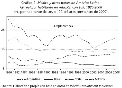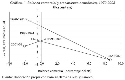 La tasa de expansión económica y el desempeño comercial muestran una pauta similar en 19952000 ya con el TLCAN, afectados por la crisis de 1995 que contrajo el PIB en más de 6%. En lo que va del presente siglo, y casi 20 años después de que se inició el proceso de reformas liberales, la economía de México padece un déficit comercial similar al de los años setenta pero creció en promedio tan sólo a una tercera parte de la velocidad de entonces. Es decir, con un uso proporcionalmente similar de divisas, la economía de México en 20002008 creció por debajo de sus pautas históricas, no obstante la robusta expansión de la economía mundial, el franco acceso al mercado de capitales y la mejora de términos de intercambio. Tan bajo crecimiento de la economía impide generar suficientes puestos para absorber la expansión de la fuerza de trabajo. De acuerdo con diversas estimaciones, el PIB de México requiere crecer cuando menos a 5% anual para crear anualmente entre 800 mil y un millón de empleos. Si además se quisiese reducir de manera significativa la pobreza -que actualmente afecta a más de 40% de la población y, en su forma extrema, la pobreza alimentaria, a poco más de 10%- , la expansión económica debería ser aun mayor.
