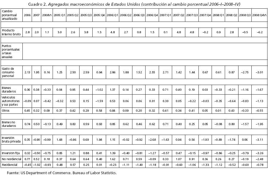 Una vez que se han expuesto las razones para sustentar el cambio, conviene evaluar algunos de los cambios más importantes en la coyuntura de la economía de Estados Unidos que están afectando a la economía mexicana. En el cuadro 1 se presenta información sobre la evolución del pib de Estados Unidos y algunos componentes principales con el propósito de comparar los indicadores de la crisis actual con los de la anterior de 20012002. El hecho más destacado es que mientras que en la anterior recesión el principal factor de la caída económica fue la drástica reducción en la inversión privada (7.9%), de manera notoria la no residencial, en la actual tanto la inversión como el consumo privado se reducen. En el cuadro 2 la información trimestral permite apreciar mejor la dinámica de la recesión. La caída más fuerte se experimenta en el último trimestre de 2008 (a una tasa anualizada de 6.2%), a la cual la contracción de la demanda de consumo privado contribuye con casi la mitad (3.01) y la inversión privada con otro tanto (3.11%). Dada la altísima acumulación de deuda por parte de los agentes privados (familias y empresas), combinado con la drástica caída que se viene experimentando en sus activos (reales y financieros), la necesidad de cubrir sus obligaciones y el grave desarreglo bancario y financiero, se entiende la seria preocupación de que las cifras indiquen apenas el inicio de un ciclo recesivo de larga duración y mayor profundidad. A lo anterior hay que agregar que se espera que la mecánica propia del mercado de bienes raíces sobrepase a la baja los niveles de equilibrio de largo plazo de estos bienes. Sin embargo, hay que notar el altísimo endeudamiento en que está incurriendo el gobierno para contener la dinámica recesiva y estabilizar los mercados financieros. De particular importancia para México es la caída drástica en la demanda de vehículos de transporte y equipo de telecomunicaciones, sectores en los que México aumentó su especialización con el TLCAN.