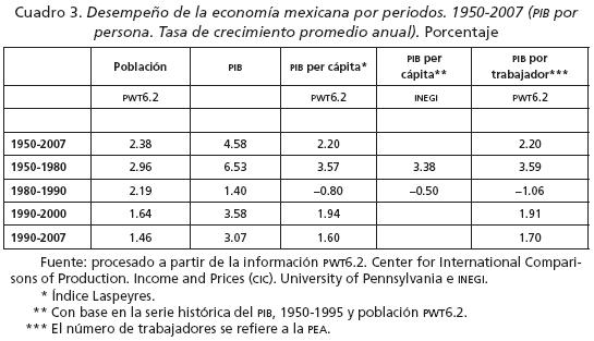 Al retomar el estudio de la crisis de largo plazo, vemos que México no ha tenido un buen desempeño económico ni en términos absolutos ni cuando se le compara con otras economías. Para tener una mejor perspectiva de su desempeño, el cuadro 3 presenta una síntesis de la evolución del pib por persona ocupada, a partir de 1950. Con base en las cifras de PWT 6.2, se observa un pobre desempeño de la productividad laboral (PID por trabajador de la PEA) para los últimos 50 años, de apenas un crecimiento promedio anual de 1.52%. Éste es el resultado de un contraste de tres periodos: entre 1950 y 1980 el crecimiento alcanzó 3.32% anual, el cual sin ser sobresaliente es considerablemente superior a 1.24% correspondiente al periodo posterior a 1990. Se separa el periodo correspondiente a la década de los ochenta, con un desempeño negativo, por considerar que en gran medida es el resultado de la crisis financiera que estalla en 1981 y genera la fuerte inestabilidad económica, y también porque no es sino hasta 19851987 que se inicia claramente el modelo de orientación hacia el exterior.