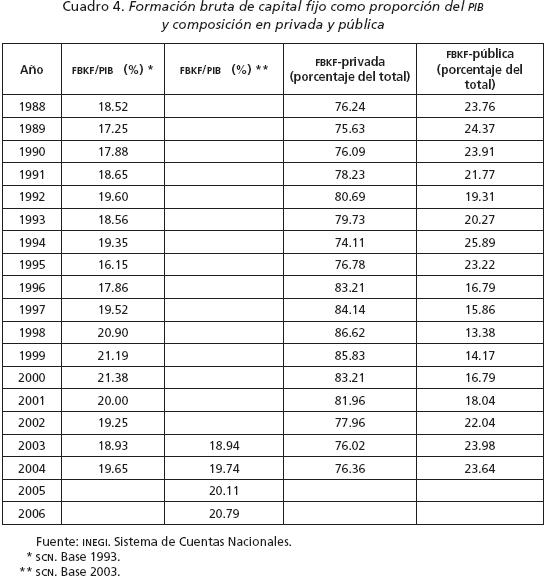 De naturaleza distinta es el deficiente comportamiento de la acumulación de capital. En el cuadro 4 se describe el comportamiento de la inversión fija. Las tasas de participación de la FBKF en el PIB oscilan alrededor de 20%, con algunos años ligeramente por arriba de esta cifra, pero en su mayoría por debajo. Estos coeficientes son relativamente bajos cuando se comparan con los correspondientes a economías asiáticas, como China y Corea del Sur, que superan 30%. En cuanto a su composición se observa una tendencia al alza de la inversión privada hasta 2001, lo cual es congruente con la política de reducción en la participación del Estado en la economía. Entre 2002 y 2004, durante la administración de Fox, hubo un ligero repunte de la inversión pública.
