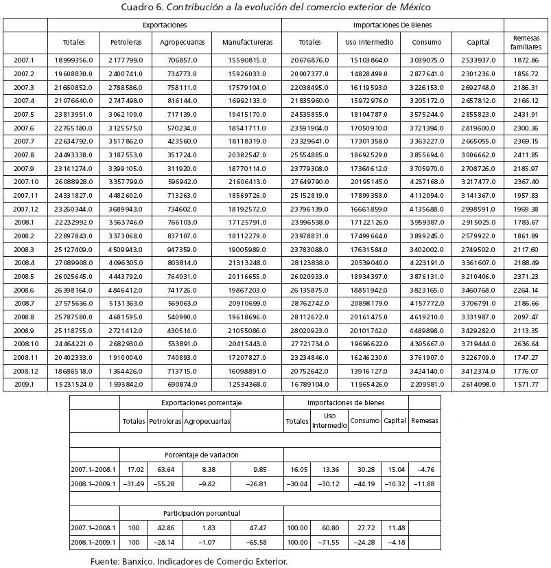 Los efectos negativos se producen tanto a partir de los canales comerciales como de los financieros y cambiarios. La recesión en Estados Unidos y en el mundo en su conjunto ha provocado, inmediata y directamente, la caída de las exportaciones de bienes que se fabrican en México, una drástica baja en el precio de la mezcla mexicana de crudo y una baja sustancial en la actividad industrial, de manera destacada en la eme , pero también en el sector automotriz y el electrónico y de telecomunicaciones. Como se aprecia en el cuadro 6, después de un incremento sólido de las exportaciones entre enero de 2007 y enero de 2008 (17.02%), las exportaciones presentaron un desplome que representa más de 30% entre enero de 2008 y enero de 2009; la caída más pronunciada se produjo en los ingresos por venta de petróleo crudo (55.28%), seguido por el de manufacturas (26.81%); más reveladoras son las cifras de la participación porcentual de cada rubro exportador en el total de la baja de ingresos por exportaciones. El sector manufacturero es responsable de casi dos terceras partes, seguida por las petroleras con casi 30%; por cierto que las exportaciones agropecuarias tienen una contribución muy pequeña, de aproximadamente 1%. Debido a la fuerte interrelación entre las exportaciones y las importaciones, además del efecto de caída de la producción nacional, las importaciones también cayeron en proporciones semejantes; las totales y las de uso intermedio caen en aproximadamente 30%, mientras que las de consumo en 44% y las de capital en 10.32%. La mayor contribución a la caída se originó en las importaciones de uso intermedio, con casi 72% del total.
