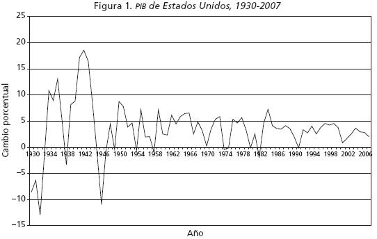 Durante este lapso de un poco más de un cuarto de siglo, la economía de Estados Unidos tuvo un desempeño regular en términos de crecimiento y estabilidad económica. Efectivamente, el PIB creció a una tasa promedio anual de 3.03% en comparación con una tasa de 3.8% durante el periodo previo, de 1950 a 1980. Como puede apreciarse en la figura 1, esta expansión se dio en medio de fuertes variaciones, siendo menos pronunciada la del último periodo: el coeficiente de variación (desviación estándar entre el promedio) es considerablemente menor en el último periodo, 0.56, que en el anterior, 1.4; si se toma la frecuencia trimestral, la diferencia es de entre 0.88 y 1.4 respectivamente. Éste es un rasgo interesante pues en el periodo anterior dominó la política de regulación del ciclo económico basada en los ajustes de tipo keynesiano, mientras que en el último periodo, por lo contrario, se impuso la política de no interferencia del gobierno en los asuntos de mercado, excepto en momentos de crisis, como los que ambién se identifican en la figura 1: 19901991, 20002001 y 2007 en adelante. En cuanto a estabilidad económica, el último periodo tiene en promedio una tasa de inflación de 3.1% anual contra 4.1% del periodo anterior.