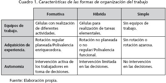 Las distintas formas organizacionales pueden diferenciarse a partir de: a) la complejidad que adquieren los equipos de trabajo; b) la importancia de la adquisición de experiencias en el proceso de trabajo, y c) el grado de autonomía de los trabajadores.