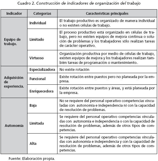 En el marco del presente estudio y tomando como referencia lo mencionado anteriormente, la posibilidad de dar cuenta de las formas de organización del trabajo está vinculada a la construcción de tres indicadores, los cuales permiten conocer la forma en la que se desarrollan el proceso productivo (equipos de trabajo), la polivalencia y la autonomía de los trabajadores.