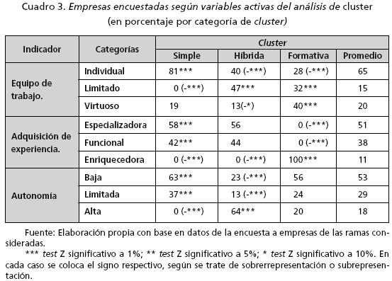 El cluster caracterizado como "formativo" incluye a menos de 10% de las empresas seleccionadas. Entre estas empresas, el aprendizaje en las células de trabajo desempeña una función clave que se refleja en el predominio de equipos de trabajo virtuosos o, al menos, limitados (72 vs. 35% promedio) y en formas enriquecedoras de adquisición de experiencias que consideran la rotación planeada del personal. No existe, sin embargo, una característica sobresaliente de este cluster en lo referente al grado de autonomía con que cuenta el personal operativo. Lo anterior se manifiesta en que se requieren escasas competencias de este tipo de personal en 56% de los casos, porcentaje similar a 53% observado para la media muestral (cuadro 3).
