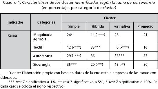 Como se observa en el cuadro 4, existe una marcada diferenciación entre las empresas que forman parte de las distintas ramas en función de la forma de organización del trabajo que las caracteriza. Así, dentro del grupo de empresas formativas, sobresalen las empresas proveedoras del sector automotriz (56 vs. 33% en el promedio general). En el cluster híbrido se destacan las empresas asociadas al sector textil (33 vs. 16%) y, finalmente, entre las organizaciones simples prevalecen las empresas de la rama siderúrgica (35 vs. 30% en el promedio general) y, en menor medida, de maquinaria agrícola (24 vs. 21%, promedio).5