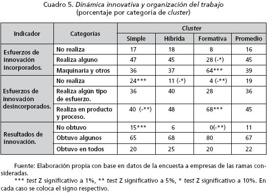 En lo referente a la relación entre dinámica innovativa y organización del trabajo, se observa que el cluster formativo se caracteriza por contar con una mayor proporción de empresas que han realizado esfuerzos de mayor complejidad relativa en tecnología incorporada en bienes de capital (64 vs. 39%). Este mismo grupo se destaca también por haber realizado esfuerzos más refinados en tecnología no incorporada (68 vs. 45%). Este dato es especialmente relevante cuando se le compara con el comportamiento del cluster simple, donde sobresalen las empresas que no realizaron esfuerzos de innovación de este tipo (24 frente a 19%). A su vez, este último grupo de empresas también se distingue por una mayor proporción que dice no haber obtenido resultados en innovaciones concretas (15 frente a un 11%) (cuadro 5).