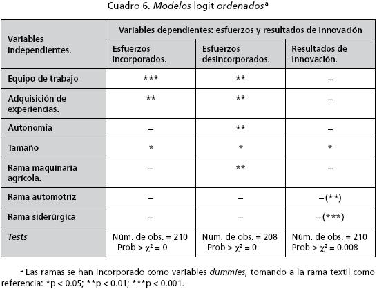 Un primer aspecto a destacar en torno al modelo que toma como variable dependiente a los esfuerzos de innovación incorporados, es la importancia que adquieren la adquisición de experiencias y las características de los equipos de trabajo en la definición de la complejidad alcanzada por las actividades de innovación realizadas. En este sentido, se observa, por un lado, que en las empresas que presentan como característica distintiva la existencia de equipos de trabajo y, más específicamente, grupos para solucionar problemas, la probabilidad de realizar esfuerzos de innovación de mayor complejidad es más alta que en el resto de los agentes. Por otro lado, las empresas que poseen esquemas de rotación planeada evidencian una mayor probabilidad de realizar esfuerzos en distintas áreas de adquisición de tecnología incorporada. De esta manera, en el primero de los modelos planteados se verifica una relación positiva entre las características de los procesos de adquisición de experiencias y de los equipos de trabajo, por un lado, y los esfuerzos de innovación incorporados que realizan las empresas, por el otro (cuadro 6).