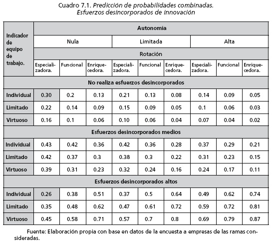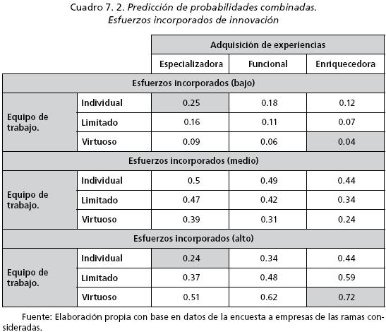 En primer lugar, el cuadro 7.1 presenta las probabilidades combinadas de desarrollar distintos niveles de esfuerzos de innovación desincorporados, dados diferentes niveles en los indicadores de equipo de trabajo, adquisición de experiencias y autonomía del personal operativo.