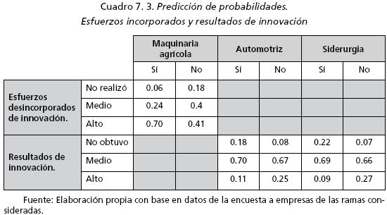 La predicción de probabilidades (cuadro 7.3) retoma la importancia de pertenecer a cada una de las ramas en la realización de esfuerzos de innovación desincorporados y en la obtención de resultados de innovación.
