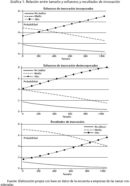 Finalmente, la gráfica 1 muestra la relación existente entre los esfuerzos y resultados de innovación y el tamaño de las empresas. Los modelos probabilísticos estimados evidencian la existencia de una relación positiva entre esfuerzos y resultados de innovación, por un lado, y tamaño de las empresas, por el otro.