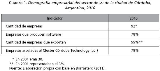 En el año 2001 el total de empresas ascendía a 30, es decir, un tercio de la cantidad actual.10 El grupo de las exportadoras representaba en ese año el 3% del total, mientras que en 2010 ascendía a 55%. Además, en 2010 era muy alta la proporción de empresas (78%) que producían software el segmento de mayor complejidad, mientras que en 2001 presentaban un nivel tecnológico medio. Por último, en 2010 era alto el grado de asociación institucional observado en el sector: el 78% de las empresas estaban asociadas al Cluster Córdoba Technology (CCT), entidad civil de promoción de las pymes del sector fundada a fines de 2001.