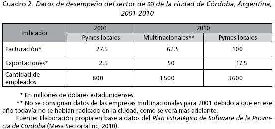 Con respecto a los datos de empleo, se observa que en las pymes locales este indicador se ha cuadruplicado a lo largo de la década, al pasar de 800 empleados en 2001 a 3 600 en 2010. Vale aclarar que el total consignado en el cuadro 2 corresponde exclusivamente a los ingenieros y técnicos empleados en las pymes del sector. Si se suman a ellos los empleados de la administración y tareas anexas, el total de trabajadores llegaba a 10 000 en 2010. Según datos de la prensa especializada, el sector de SSI es actualmente uno de los mayores generadores de empleo en la provincia de Córdoba.11 Por otra parte, corresponde resaltar que se trata en términos generales de un sector de alta calificación. Los niveles de facturación, como puede observarse, han crecido significativamente, pasando de 27.5 millones de dólares estadunidenses en 2001 a 100 millones en 2010. Y un último dato llamativo es que, a excepción del monto de exportaciones, el desempeño del sector local en 2010 fue claramente superior al del sector transnacional.
