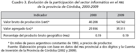 En el cuadro 3 se observan los guarismos para el valor bruto de la producción (VBP) y el valor agregado (VA) del sector entre 2000 y 2009, así como la participación relativa del sector en la estructura del producto bruto geográfico (PBG) de la provincia de Córdoba.