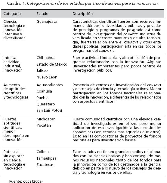 Debido a la falta de datos subnacionales, no es posible comparar cuantitativamente a los estados mexicanos en cuanto a innovación regional. Como el gasto en investigación y desarrollo por actor no está disponible, el uso de algunos programas nacionales se aprovecha como valor sustitutivo aproximado. En este análisis se usaron los resultados de Estudios de la OCDE de innovación regional. 15 estados mexicanos (OCDE, 2009) y las entidades seleccionadas se agruparon en categorías que describen el tipo de activos para la innovación (véase cuadro 1).