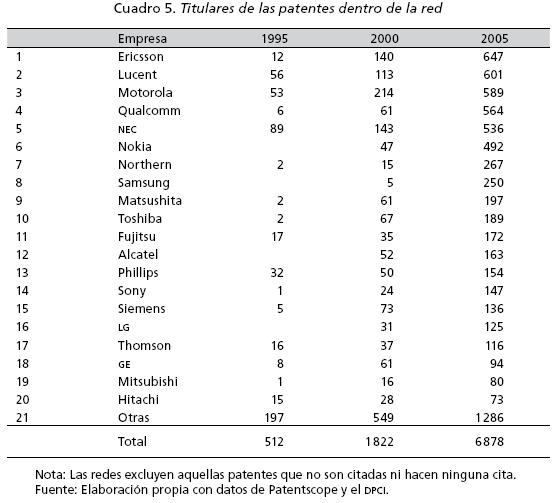 Utilizando los códigos CIP, así como el nombre de las empresas, en la búsqueda por palabras clave, fue posible identificar 9 212 patentes relacionadas con el campo tecnológico considerado en este estudio que contienen al menos una cita referente a las patentes originales. Para observar los cambios de posición a lo largo de la trayectoria tecnológica se analizaron tres periodos: 1995, 2000 y 2005. Se asignaron las patentes a cada periodo utilizando la fecha de solicitud, pues se considera que es la más cercana a la invención. El cuadro 5 muestra las veinte principales compañías por titularidad de patentes, así como por su presencia en las diferentes redes, es decir por las patentes que han sido citadas o que citan a otras patentes en su informe sobre el estado de la técnica.