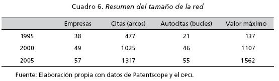 A continuación se presentan las redes resultantes a partir del análisis de las citas de patentes durante los periodos definidos, mediante el uso del paquete informático Ucinet (Borgatti, Everett y Freeman, 2002). El cuadro 6 muestra un resumen del tamaño de la red, el número de empresas (nodos), el número de citas (arcos) y el número de autocitas (bucles), así como el valor máximo de arcos (es decir, el número máximo de citas entre dos empresas).