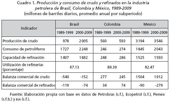 Los principales indicadores de producción, consumo y balanza comercial de petróleo crudo y refinado en los tres países (cuadro 1) muestran lo siguiente: la producción anual promedio de crudo se incrementó en los tres países Brasil, 104%; México, 11%, y Colombia, 6%. En efecto, si bien México continuó como el mayor productor, Brasil aumentó considerablemente su nivel de producción y Colombia ligeramente. En relación al consumo promedio de productos refinados, en los tres países hubo un incremento Brasil, 53%; Colombia, 5%, y México, 6%. A su vez, con relación al crecimiento de la capacidad de refinar petróleo, el mayor cambio se registró de nuevo en Brasil (48.6%), seguido de Colombia (6.7%) y México (2.1%). Finalmente, si bien el porcentaje de utilización de sus refinerías es similar entre los tres (82% a 89%), en México es más bajo que en Brasil y Colombia.