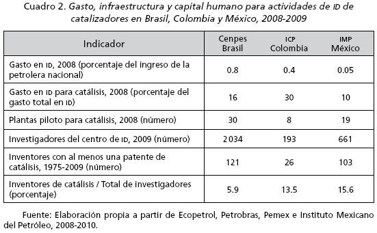 En relación con la producción de conocimiento sobre catalizadores registrado en las oficinas nacionales de patentes de cada país (19852009), la evidencia para este periodo indica lo siguiente: En el Instituto Nacional da Propriedade Industrial (INPI) de Brasil se han registrado más de 400 solicitudes de patente sobre catalizadores. En el Instituto Mexicano de la Propiedad Industrial (IMPI) se presentaron 230 solicitudes y en la Superintendencia de Industria y Comercio (SIC) de Colombia se registraron 135 solicitudes de catalizadores. En Brasil, el 21% de las patentes solicitadas fueron presentadas por empresas o centros de ID residentes, mientras que en México este indicador fue de 9% y en Colombia alcanzó sólo el 7%. En la última década, a los residentes mexicanos se les ha otorgado un total de 55 patentes de catalizadores, a los brasileños 30 y a los colombianos tres, lo cual muestra cómo en México la producción de conocimiento medida por patentes ha sido significativa en comparación con Brasil y Colombia, aunque no se ha plasmado en el desarrollo de capacidades de refinación.