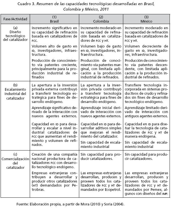 Brasil construyó, desarrolló y acumuló capacidad tecnológica exitosamente, alcanzando en la última década una modalidad de innovación tecnológica de catalizadores con mayor grado endógeno (C) que México o Colombia. En parte, esto ha sido un resultado de los cambios institucionales en la industria del petróleo desde la década de los noventa, que fomentaron la inversión y la competencia, al transformar el monopolio estatal en un oligopolio con la presencia de capital privado nacional y extranjero. Con ello, también se favoreció tanto la transferencia de tecnología como la construcción y desarrollo de capacidad tecnológica propia. Ésta se constata en el alto nivel de gasto en ID, en el número de investigadores de la empresa petrolera nacional y, particularmente, de los dedicados a desarrollar catalizadores, así como en la infraestructura para ID y en la capacidad para producir conocimiento tecnológico medido por patentes. Asimismo se observa en el incremento de su capacidad para producir crudo y refinados en la última década, y en la disminución de su déficit de comercio exterior de estos productos. En suma, las industrias petrolera y de catalizadores de Brasil sobresalen entre los tres países analizados como las de mayor dinamismo institucional, tecnológico y económico en la última década.