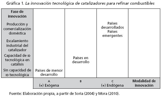 En suma, conforme se alcanza la fase más alta comercialización y producción del catalizador, el proceso de construcción y desarrollo de capacidades tecnológicas se vuelve más endógeno y es característico de países desarrollados y algunos emergentes. Al contrario, a menor desarrollo relativo de los países casi no existen capacidades tecnológicas, por lo tanto, las innovaciones tecnológicas requeridas se transfieren casi plenamente por importación del producto final.