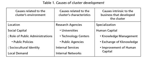 Similarly, an element that takes the shape of formal networks among individuals is the sociocultural identity, which greatly simplifies access to resources and information as a result of trust and cooperation (Nicolini, 2001; Liao, 2010), and benefits companies due to knowledge transfer (Nassimbeni, 2001; Cotic-Svetina, Jaklic and Prodan, 2008; Kong, 2011; Liu, 2011; Nishimura and Okamuro, 2011; Kamnungwut and Guy, 2012; Molina-Morales, et al., 2012; Nakwa, Zawdie and Intarakumnerd, 2012; Ng and Thiruchelvam, 2012; Gebreeyesus and Mohnen, 2013). Moreover, an important aspect of the cluster's environment is the local demand, as it symbolizes the first challenge and encourages its exit to larger markets (Rabellotti, 1997; Nicolini, 2001; Diez-Vial, 2011).