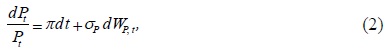 donde π es la tasa media esperada de inflación, sP es la variación esperada de la tasa de inflación y Wpt es un proceso de Wiener, también llamado movimiento browniano, que está definido sobre un espacio fijo de probabilidad con su filtración aumentada (Ω, F, (Ftw)t ∈[0,T], P). En este caso, los parámetros π y σP son exógenos.