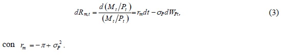El agente económico mantiene saldos monetarios reales Mt/Pt = mt donde Mt es el acervo nominal de dinero. La tasa de retorno estocástica por la tenencia de saldos monetarios reales está dada por el cambio porcentual del precio del dinero en términos de los bienes. Se supone además que el rendimiento marginal del dinero es cero, es decir, dMt= 0. La aplicación del lema de Itô al cambio porcentual del inverso del nivel de precios cuando se considera al nivel general de éstos como el proceso subyacente, conduce al rendimiento por la tenencia de saldos reales
