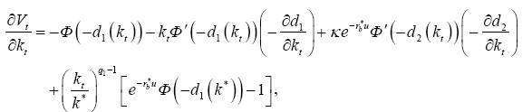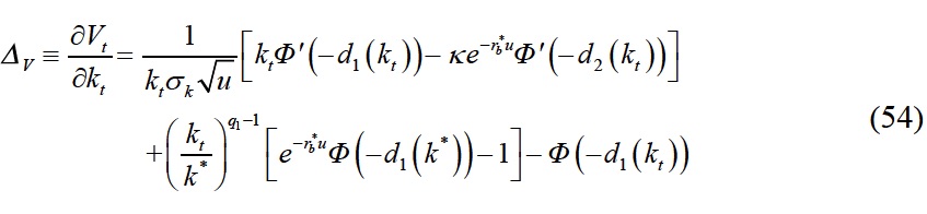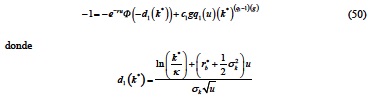 , porque a partir de la ecuación (58) se tiene que el primer sumando es positivo, dado que Φ (-d) = 1- Φ (d), pero 0 < Φ ( d) < 1, por ser Φ (d) una función de distribución. Por otra parte, el segundo sumando también es positivo ya que Φ'(d1 (k*))> 0, lo cual se justifica mediante la ecuación (55), ya que