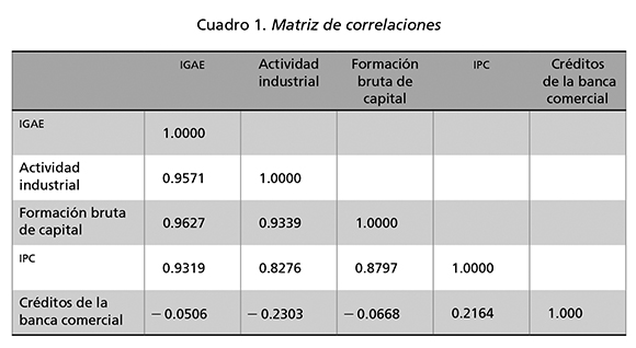 Primero, se presenta la matriz de correlaciones en el cuadro 1. Las correlaciones no condicionales sugieren que las variables que representan a la economía real y al sector financiero podrían estar integradas en el caso específico del sector bursátil. Sin embargo, en el caso de los créditos de la banca comercial, el signo es el opuesto al esperado.8 De acuerdo con Kasa (1992), la información proporcionada por los coeficientes de correlación no es suficiente para determinar si existe o no integración entre las variables.