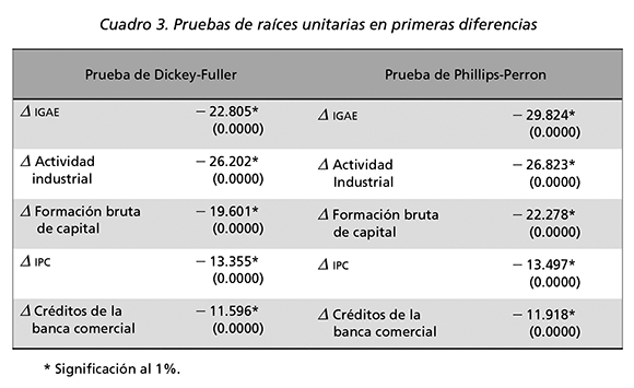 En el cuadro 2 se presentan las pruebas de raíces unitarias de Dickey y Fuller (1979) y Phillips y Perron (1988) para los niveles y en primeras diferencias. Los resultados muestran que las variables asociadas al sector financiero (créditos otorgados por la banca comercial al sector industrial e IPC) y dos de las tres que representan a la economía real (IGAE y formación bruta de capital fijo en maquinaria y equipo) son no estacionarias. En el caso de la variable de actividad industrial, las pruebas en niveles se contraponen.