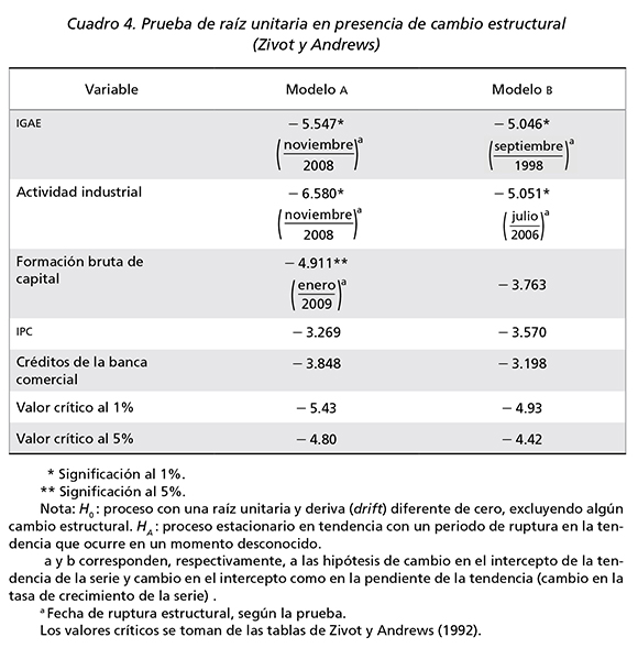Asimismo, ambas pruebas en primeras diferencias para las variables antes mencionadas, nos indican que son estacionarias, lo que significa que son integradas de orden 1, I (1), lo que se puede ver en el cuadro 3. Sin embargo, estos resultados deben de tomarse con reserva, pues no consideran la presencia de cambios estructurales. La prueba de raíces unitarias propuesta por Zivot y Andrews (1992) sí permite tomar en cuenta posibles cambios estructurales en la función de tendencia de la serie. Los resultados se presentan en el cuadro 4.