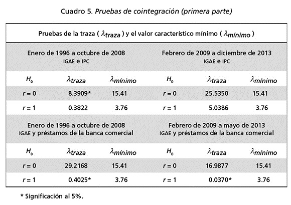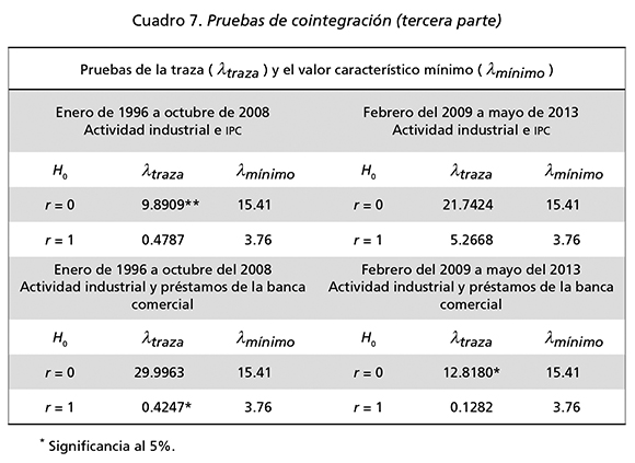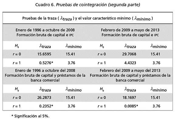 Los resultados presentados en los cuadros 5, 6 y 7 indican que para el periodo de enero de 1996 a octubre de 2008, tanto el IGAE, como la formación bruta de capital fijo en maquinaria y equipo y la actividad industrial están cointegrados con los préstamos de la banca comercial, resultado que se mantiene para el periodo de febrero del 2009 a mayo del 2013. Asimismo, la formación bruta de capital fijo en maquinaria y equipo y el IPC están cointegrados en el periodo enero de 1996 a octubre de 2008.