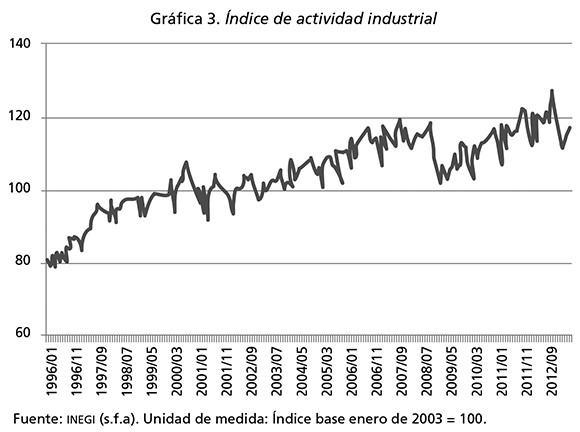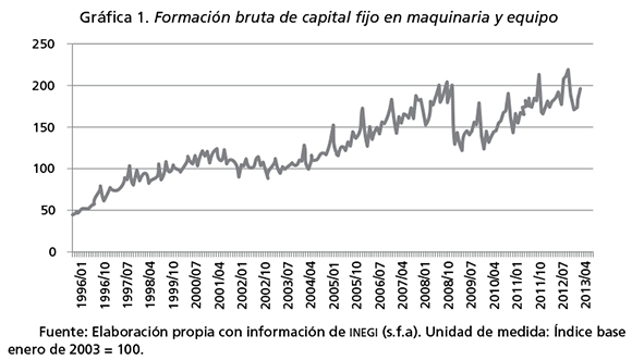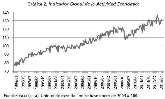 Adicionalmente, se utiliza el IGAE, indicador que muestra la evolución de la actividad económica del país (grafica 2). Para su elaboración se utiliza el esquema conceptual y metodológico de la contabilidad nacional, el mismo que sigue el cálculo del PIB trimestral, Es importante destacar que la información básica que incorpora este indicador es muy preliminar, está sujeta a cambios y no incluye todas las actividades económicas, como sucede con el PIB trimestral, pero sí contiene información con respecto al sistema financiero. Por ello, sus resultados pueden diferir de los del PIB trimestral y debe considerársele como un indicador de la tendencia o dirección de la actividad económica en el país en el corto plazo. Sin embargo, como ya se mencionó, la formación bruta de capital fijo en maquinaria y equipo funcionaría mejor como una variable para medir indirectamente la actividad económica real y la inclusión del IGAE tiene la finalidad de comparar el presente estudio con otros trabajos sobre caso mexicano.