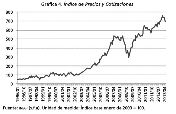 Por el lado del sistema financiero, la mayoría de los trabajos toman el IPC como variable para medir indirectamente este sector en el caso mexicano y, asimismo, este tipo de índices accionarios son los que se utilizan principalmente en estudios a nivel internacional (grafica 4). El IPC es un indicador de la evolución del mercado accionario que se calcula en función de las variaciones de una selección de acciones, llamada muestra, balanceada, ponderada y representativa de todas las acciones cotizadas en la Bolsa Mexicana de Valores.