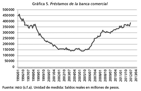 Por otra parte, una variable que refleja la actividad del sector financiero y puede respaldar o, en su caso, refutar los resultados obtenidos mediante el análisis del sector bursátil, son los préstamos bancarios al sector industrial (gráfica 5). Tales créditos indican de manera más tangible si el sistema financiero está cumpliendo con su función de intermediación entre ahorradores y empresas o emprendedores. Los préstamos bancarios están directamente relacionados con la formación bruta de capital fijo en maquinaria y equipo requeridos por el sector industrial para producir, ya que su adquisición requiere de financiamiento. Hay que recordar que éste proviene de tres fuentes: recursos propios, bolsa de valores y préstamos bancarios. En este sentido, para que los resultados fueran más robustos, se definió como sector financiero a la bolsa de valores y al sector bancario, en la medida en que se pretende analizar la posible desvinculación del sistema financiero con la economía real.