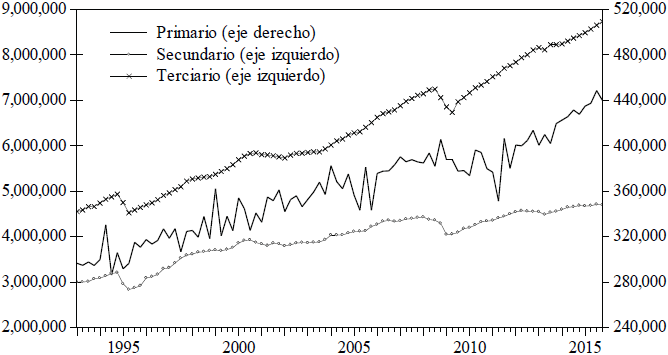 En el análisis que se presenta en esta sección se emplea el PIB de los sectores primario, secundario y terciario como representantes del desempeño económico en el nivel sectorial. Como representantes de la inversión pública y privada se utilizan los datos de la formación bruta de capital fijo, tanto público como privado. Como tasa de interés relevante se emplea la Tasa de Interés Interbancaria de Equilibrio (TIIE) a 28 días. Todas las observaciones corresponden al valor final alcanzado al final de los trimestres comprendidos en el periodo que va desde el inicio de 1993 hasta fines de 2015. Los datos sobre el PIB sectorial, así como la formación bruta de capital fijo, tanto público como privado, y la TIIE a 28 días, se han tomado del sitio web del Banco de México.