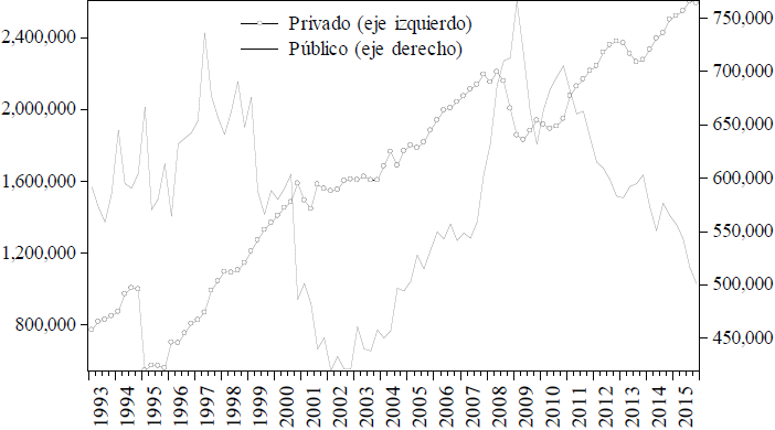 La Figura 2 muestra el comportamiento de la inversión privada y pública en términos reales. A simple vista destaca que entre 1993 y 2015 el comportamiento de la inversión pública, además de ser de menor cuantía, ha sido mucho más errático que el observado en la inversión privada. Es ostensible que la caída, que se ha dado en forma sostenida a partir de principios de 2009, ha llevado a que, a fines de 2015 la inversión pública se encuentre en niveles similares a los observados a fines de 2005, periodo en el que venía recuperándose de los mínimos observados en 2002. Por otra parte, a pesar de su tendencia creciente en el tiempo, en la inversión privada se observan caídas importantes, las cuales pueden asociarse a la crisis mexicana gestada durante 1994 y la crisis mundial desatada en 2008; también pueden observarse caídas de menor escala como las ocurridas a principio de 2001 e inicios de 2013. Como se señaló, la inversión pública muestra una dinámica con caídas más abruptas, siendo claramente notables las caídas observadas a fines de 2000 y de 2009. Cabe destacar que de acuerdo con las tablas de origen-destino de la formación bruta de capital fijo publicadas por el Instituto Nacional de Estadística y Geografía (INEGI)5, la inversión destinada a las actividades primarias en relación con el total pasó de 3.3 por ciento a 1.5 por ciento de 2003 a 2015, en una clara tendencia a la baja, mientras que el sector terciario acapara cerca de dos tercios del total de la inversión pública y privada.