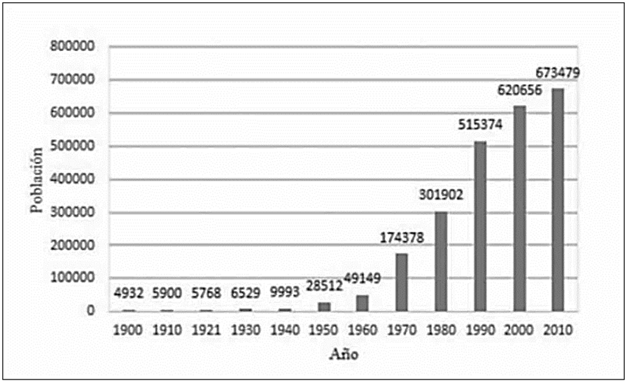 Figura 1 Crecimiento demográfico de la Ciudad de Acapulco de Juárez de 1900 a 2010. Los datos corresponden a los Censos de Población y Vivienda.