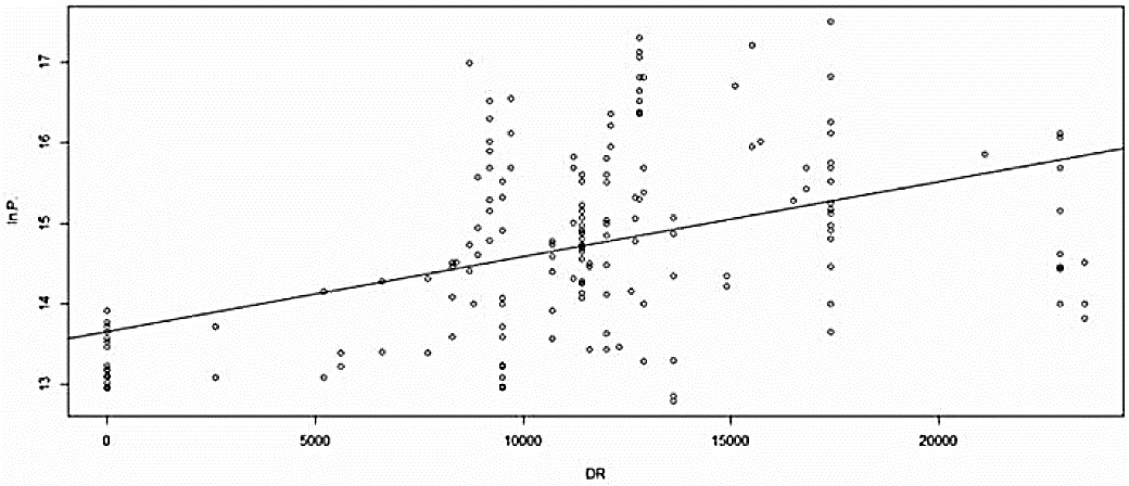 Finalmente, acerca de nuestra variable de mayor interés, la distancia a la colonia Ciudad Renacimiento resultó significativa al nivel de confianza del 95 por ciento con signo esperado. Su coeficiente 0.00001972 indica que por cada metro que la vivienda se aleje de aquella zona, su valor incrementa en 0.001972 por ciento. Así, por ejemplo, si la vivienda tiene un precio de 1 000,000 mxn, entonces el comprador estará dispuesto a pagar 19.72 mxn por cada metro que ésta se aleje de aquella zona. Entonces podemos atribuir una pérdida de valor de la vivienda cuando se vive cerca de esta colonia, la cual es la más insegura de Acapulco de Juárez; probando así nuestra hipótesis planteada. El ajuste lineal de DR contra ln(P) se muestra en la Figura 4.