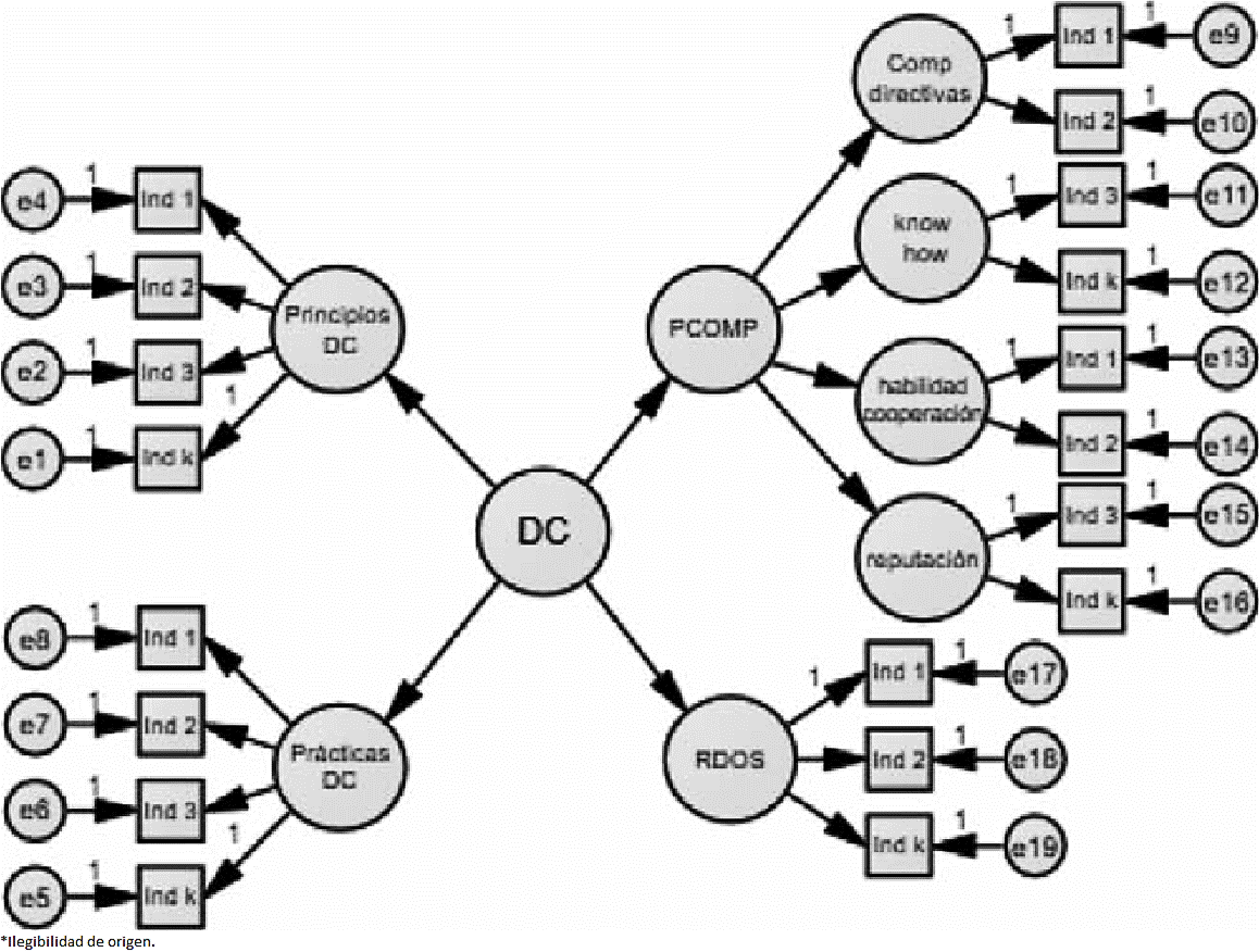 Para poder operacionalizar el modelo propuesto, el presente artículo toma como base un modelo de ecuaciones estructurales (Figura 1), basado en Escrig (2001), quien incorpora como intermediario las competencias distintivas entre la dirección de calidad y sus efectos sobre los resultados de la empresa.