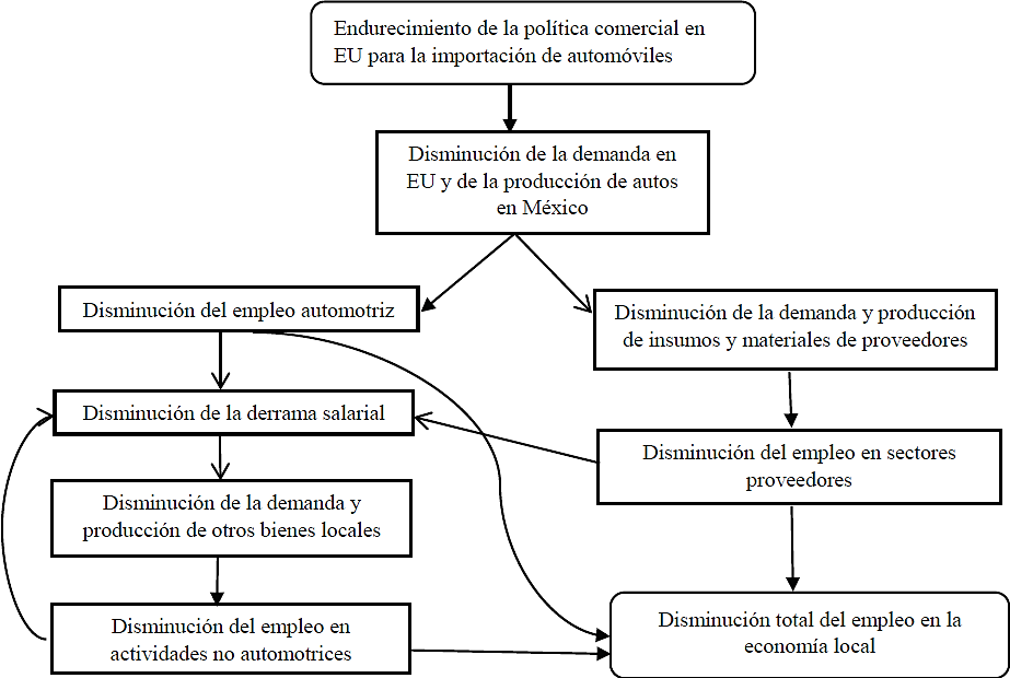 Asumiendo que las plantas armadoras automotrices en México fungen como la industria alrededor de la cual se organiza un conjunto de empresas proveedoras, algunas localizadas local o regionalmente y otras fuera del país, y que la mayoría de las empresas interrelacionadas utilizan procesos intensivos en mano de obra, se plantea que una modificación desfavorable para México de las condiciones comerciales con Estados Unidos (EU), principal destino de las exportaciones automotrices, encarecería la exportación de vehículos y autopartes hacia ese país, lo que tendría efectos no transitorios sobre el empleo y se traduciría directamente en recortes laborales en el sector automotriz e indirectamente en otras industrias relacionadas.
