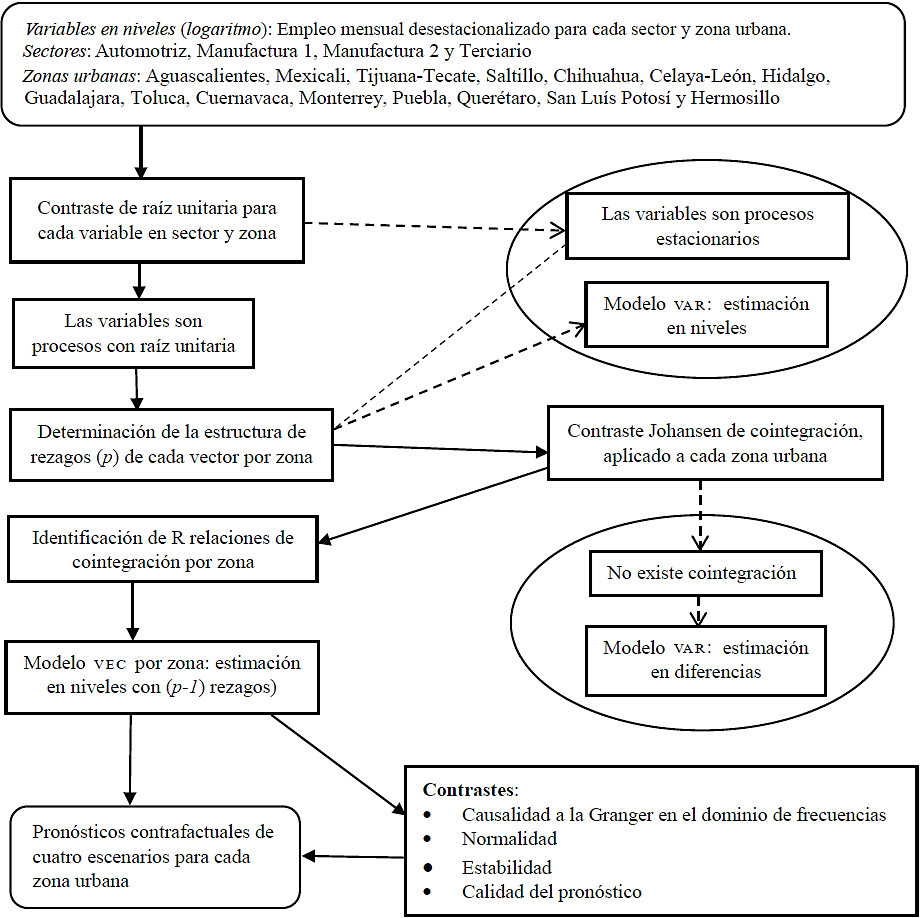 Con el objetivo de realizar predicciones contrafactuales, se estimaron modelos de Vectores de Corrección del Error (VEC) para cada una de las 15 zonas, utilizando para ello la metodología basada en Máxima Verosimilitud desarrollada por Johansen (1988, 1991 y 1995). En nuestro caso, cada vector contiene como variables el logaritmo del empleo de las actividades Auto, MAN1, MAN2 y Terciario, para cada zona y 169 observaciones mensuales (2002m12 a 2016m12). Siguiendo a Johansen (1995), el modelo a estimar para cada zona queda representado por la ecuación: