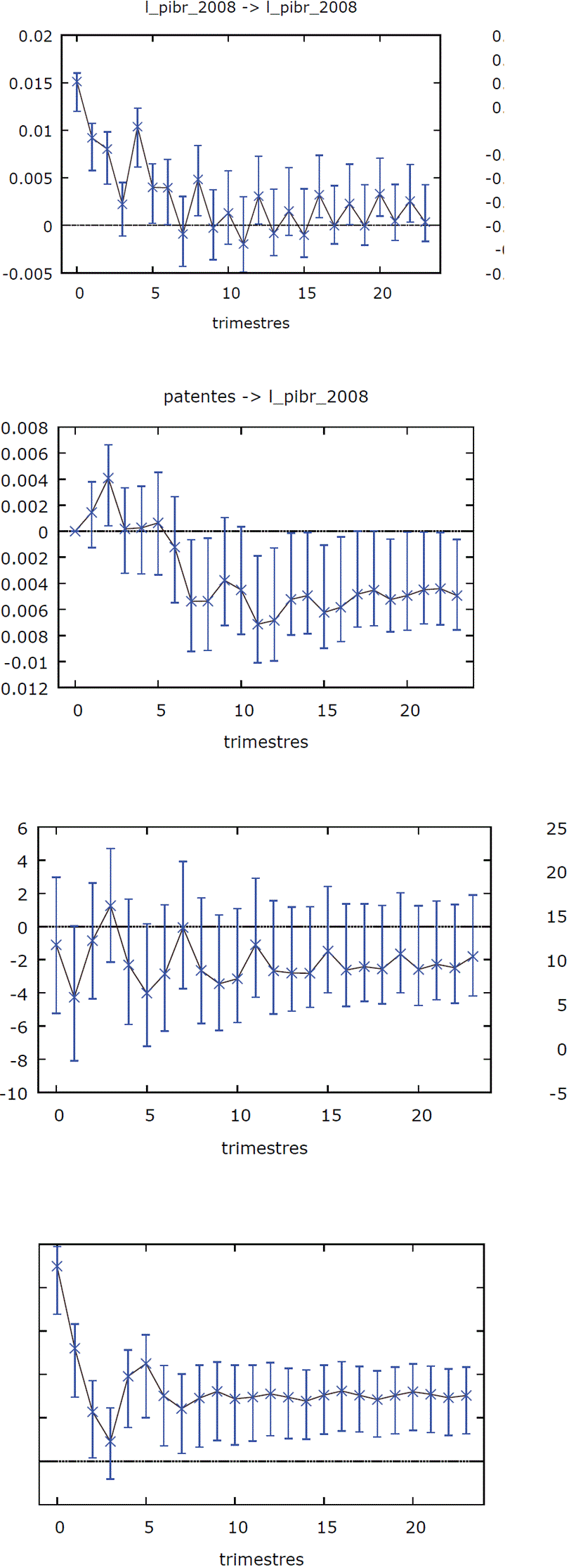 El efecto de un impulso (choque) en el PIB puede desvanecerse dentro de un periodo de ocho trimestres; pero tal efecto, en las patentes concedidas, aunque podría ser negativo, también fluctuaría en torno a cero prácticamente después de un trimestre (véase Gráfica 10). Respecto a la ocurrencia de un impulso (choque) en el número de patentes, se aprecian efectos negativos, relativamente persistentes, al mantenerse con valores distintos de cero a partir del séptimo semestre posterior sin que desaparezca su efecto. Dichos impulsos también muestran efectos persistentes y distintos de cero sobre el número de patentes. Más patentes pueden generar más patentes.