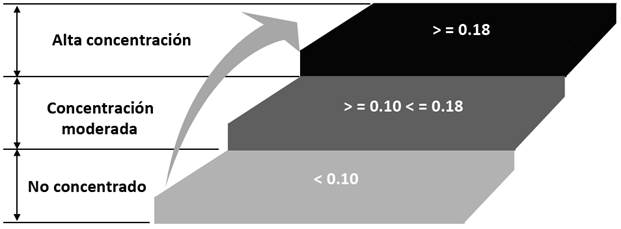 Gráfica 1 Criterios de evaluación del índice de concentración HHI