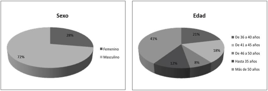 Del total de los 184 profesores-investigadores encuestados, sólo 28 % son mujeres (Figura 1), dato que es inferior al proporcionado por Conacyt, acerca de que 34.9 % de los integrantes del SNI en 2015 fueron mujeres.9 Lo anterior podría denotar una baja participación del sexo femenino en la encuesta, o que el componente de género tiene connotaciones regionales. En la misma figura se presentan los rangos de edad de los participantes. Al respecto destaca que poco más de la mitad de ellos (51%) tienen 45 años o menos, lo cual pone de manifiesto el relevo generacional que se ha venido dando en las IES de Baja California en los últimos años.
